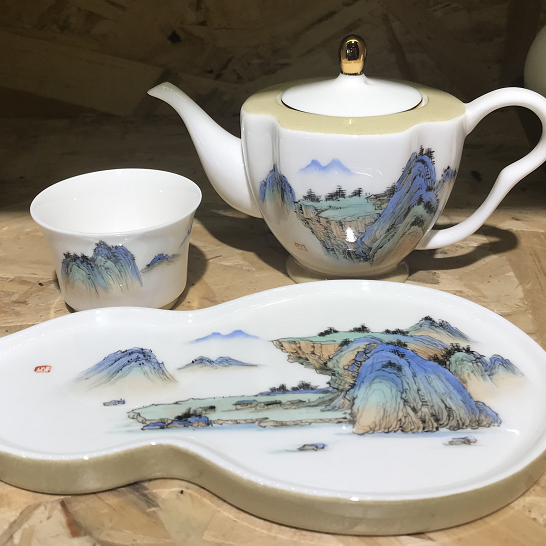 【非遗助残】【唐山骨瓷】手绘千里江山茶具