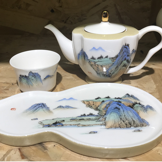 【非遗助残】【唐山骨瓷】手绘千里江山茶具